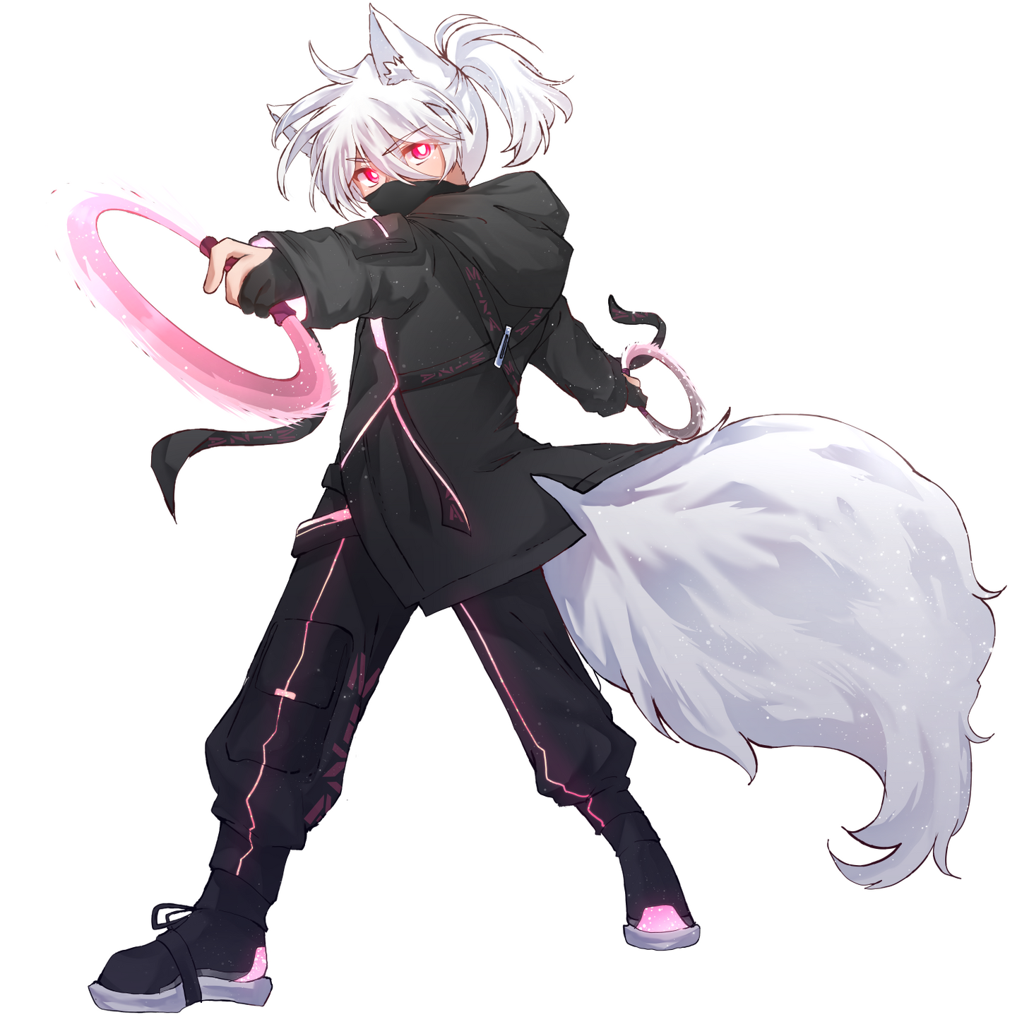 Design (for more, check the references in Gallery)Recall has wolf-like ears and tail, the latter being very voluminous and fluffy. Their style revolves around three colors : black, white and pink. Speaking of which, their eyes are shiny pink. Their clothing style is inspired by techwear.Their top clothes are made up of two layers. The closest to the body is a tight-fitting turtle-neck shirt that rises high enough to be used as a mask. The top layer is a loose-fitting jacket with a hood and long sleeves. On their back, they have two belts bearing the Miza logo and a clip to hang their weapons. In addition, they have two gloves, each covering just two fingers.Then comes a pair of wide-leg pants, well-equipped with pockets and belts, tightening only at the ankles. These are complimented by a pair of black shoes, and the whole outfit has elements of sparkling pink.Finally, their weapon of choice is a pair of chakrams which, once activated, can cut through just about anything depending on the power at which they are rotating. These can also be launched and recalled (another reason for the name).