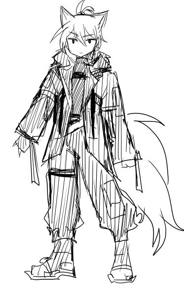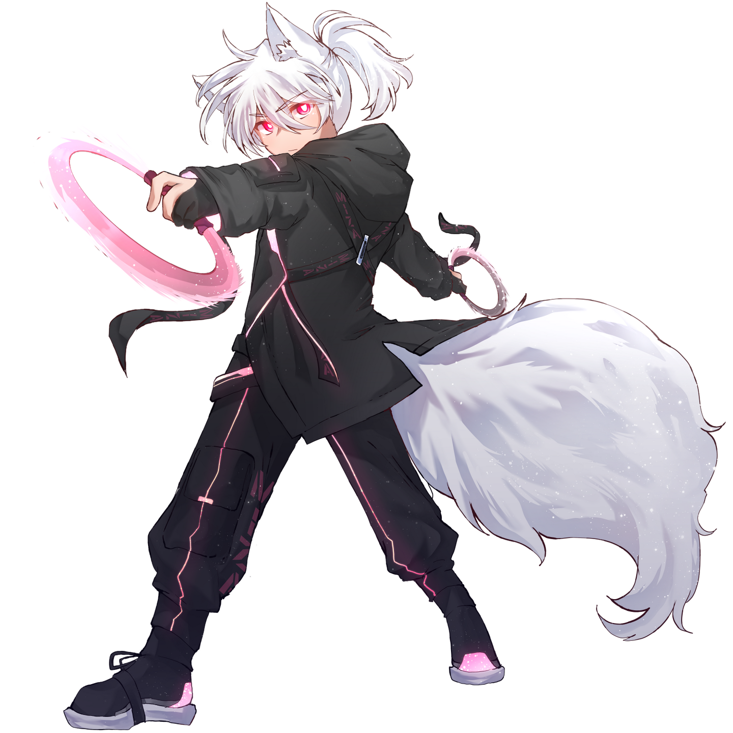 Design (for more, check the references in Gallery)Recall has wolf-like ears and tail, the latter being very voluminous and fluffy. Their style revolves around three colors : black, white and pink. Speaking of which, their eyes are shiny pink. Their clothing style is inspired by techwear.Their top clothes are made up of two layers. The closest to the body is a tight-fitting turtle-neck shirt that rises high enough to be used as a mask. The top layer is a loose-fitting jacket with a hood and long sleeves. On their back, they have two belts bearing the Miza logo and a clip to hang their weapons. In addition, they have two gloves, each covering just two fingers.Then comes a pair of wide-leg pants, well-equipped with pockets and belts, tightening only at the ankles. These are complimented by a pair of black shoes, and the whole outfit has elements of sparkling pink.Finally, their weapon of choice is a pair of chakrams which, once activated, can cut through just about anything depending on the power at which they are rotating. These can also be launched and recalled (another reason for the name).